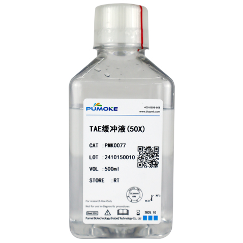 無色液體,0.22μm膜過濾純化。50×組分為2000mM Tris堿,1000mM冰醋酸,50mM EDTA,pH 8.2~8.4;核酸分子瓊脂糖凝膠和聚丙烯酰胺凝膠電泳,同時作為電泳緩沖液和凝膠制備緩沖液。