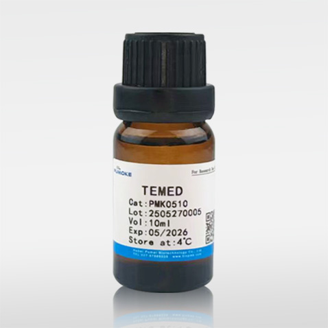 產品描述:TEMED是聚丙烯酰胺凝膠聚合的重要催化劑,在制備聚丙烯酰胺凝膠時,TEMED配合過硫酸銨(AP)使用,通過催化AP產生自由基,加速催化聚丙烯酰胺的聚合反應。