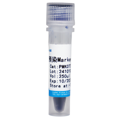 彩色預染蛋白 Marker(10- 250kDa)包含了從10kDa到250kDa 共11種高度純化并預染的重組蛋白質(10, 15, 20, 25,   30, 40,50,72,100, 130,250kDa) ,其中72kDa 條帶為橙紅色,25kDa 為綠色,其余條帶為藍色。本產品預染蛋白表觀分子量經過Bio-Rad 1610363、 thermo26610 和26614非預染蛋白質分子量標準標定,適合作為 SDS-PAGE 和 Western 的蛋白質分子量標準,可用于監測電泳過程中蛋白分離效果,檢驗Western轉膜(PVDF ,尼龍膜或 NC膜)效果,判斷蛋白的分子量大小。