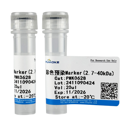 彩色預染蛋白 Marker(2.7-40kDa)包含了從2.7kDa到40kDa共9種高度純化并預染的重組蛋白質(2.7,4.2,6.5,10,15, 20,25,30,40kDa) ,其中40kDa條帶為橙紅色,10kDa為綠色,其余條帶為藍色。本產品預染蛋白表觀分子量經過 thermo26632非預染蛋白質分子量標準標定,適合作為 SDS-PAGE和 Western的蛋白質分子量標準,可用于監測電泳過程中蛋白分離效果,檢驗 Western轉膜(PVDF 、尼龍膜或 NC膜)效果,判斷蛋白的分子量大小。