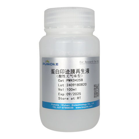 蛋白印跡膜再生液,用于免疫印跡中轉移了蛋白后膜的重復利用,可對同一張膜進行多次 Western Blot 檢 測。在免疫印跡中完成了一抗二抗結合和后續的化學發光檢測后,有時還需要檢測表達量相對穩定的內參蛋 白作為參照,或檢測其它蛋白進行比較。通過使用蛋白印跡膜再生液中特殊成份解離一抗二抗與印跡膜上抗 原的結合,在不影響抗原蛋白的情況下從而去除一抗二抗,即可非常方便地重新利用同一張膜檢測其它蛋白。與重新跑SDS-PAGE 膠比較,不僅省時省力,而且可以消除重新上樣而帶來的誤差,使可比性更強。