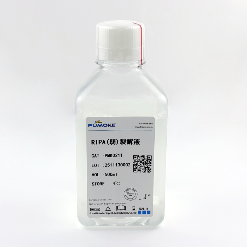 RIPA(弱)裂解液是一種傳統的細胞組織快速裂解液。RIPA裂解液裂解得到的蛋白樣品可以用于常規的PAGE、Western、免疫沉淀(IP)、免疫共沉淀(co-IP)和ELISA等。