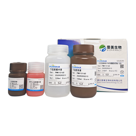 產(chǎn)品描述:本試劑盒提供了簡(jiǎn)單又快速的免染8% SDS-PAGE 彩色(紅色)凝膠配制試劑,采用上層膠(也稱濃縮膠、積層膠)和下層膠(也稱分離膠)的預(yù)混配方, 只需加入改良型促凝劑即可快速制備凝膠, 避免的傳統(tǒng)制膠法中TEMED 的惡臭味,保護(hù)了實(shí)驗(yàn)人員的身體健康,可在短時(shí)間內(nèi)制備多塊凝膠,無(wú)需計(jì)算所需溶液量,無(wú)需稀釋,操作簡(jiǎn)便。且使用本產(chǎn)品所配置的上層膠帶有顏色(紅色),使得蛋白點(diǎn)樣孔清晰呈現(xiàn),實(shí)現(xiàn)了加樣過(guò)程的可視化,極大的提高了加樣效率,有利于點(diǎn)樣和控制電泳進(jìn)程。本產(chǎn)品上層膠中的(紅色)染料可在上層膠中穩(wěn)定存在,不會(huì)隨著電泳而遷移至下層膠,不會(huì)影響電泳和蛋白染色效果, 電泳完成后也便于識(shí)別上層膠并切除。本產(chǎn)品所制備的凝膠為免染PAGE膠,蛋白條帶紫外曝光即可成像,無(wú)需染膠,也不影響后續(xù)Western Blot等實(shí)驗(yàn)。